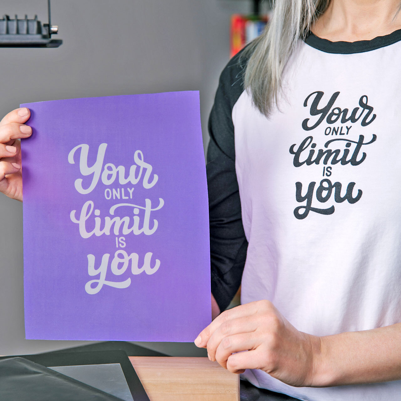 When printing multiple items, repeat designs, using a jig or multi-coloured, mounting to a frame makes printing faster and more accurate.