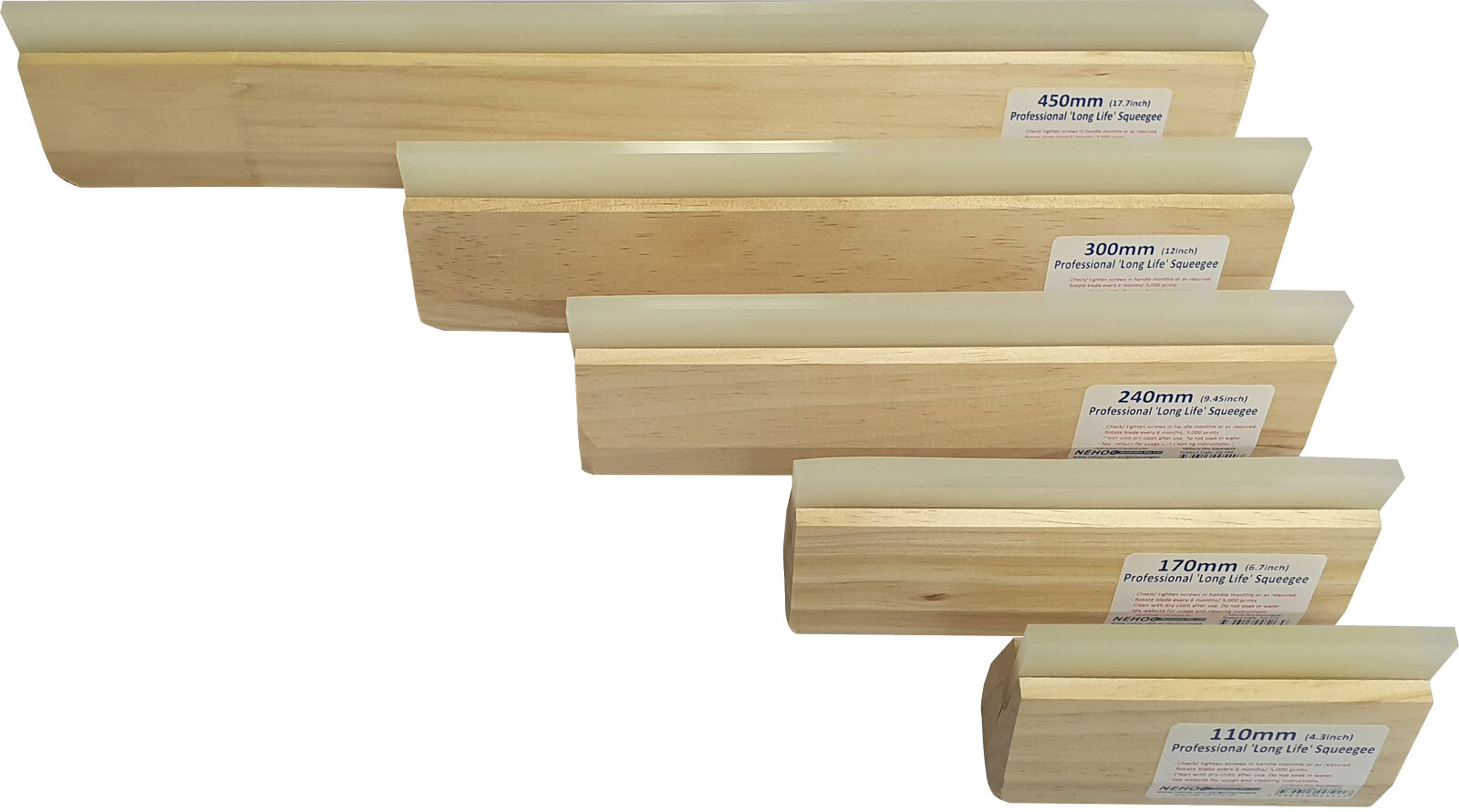 The Australian made wooden handle is designed for comfort, well balanced across the width of the blade and light to use. Screwed for an x2 lifespan compared to nailed/ glued economy squeegees on the market. Matched with a quality urethane blade for sharper prints, using less pressure and ink compared to low grade rubber used in economy squeegee's.